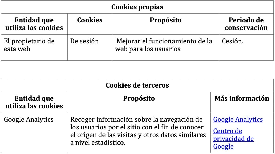 Nota: Las cookies de tipo “Propias” son utilizadas sólo por el propietario de esta web y las cookies “De terceros” son utilizadas, también, por el prestador del servicio que está detallado la tabla anterior. Puede informarse de las transferencias a terceros países que, en su caso, realizan los terceros identificados en esta política de cookies en sus correspondientes políticas (ver los enlaces facilitados en el apartado “Más información” de la tabla anterior).